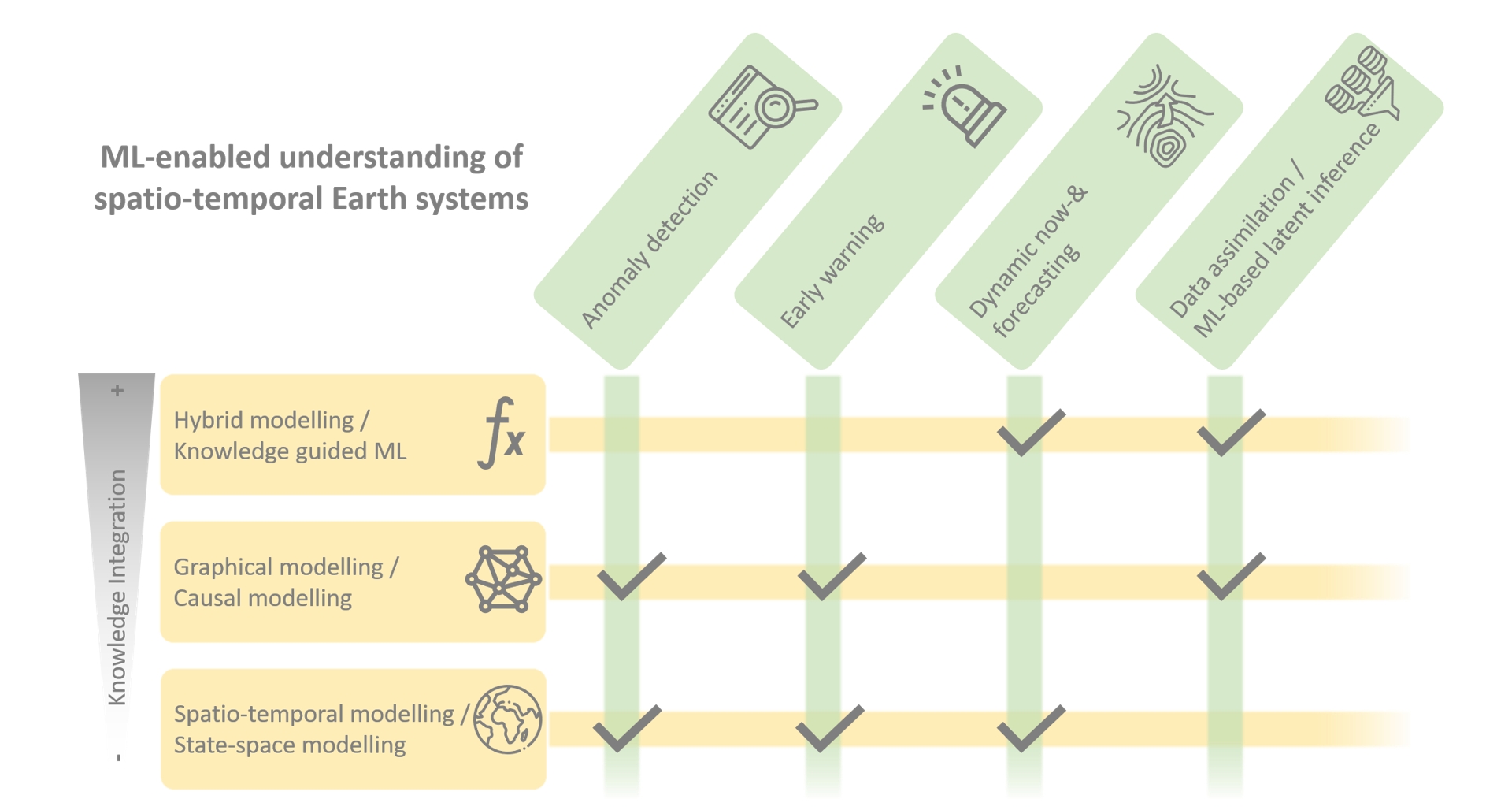 The goal of the ELLIS Unit Jena is thus to combine fundamental development in machine learning (Figure below, rows) with applied challenges concerning spatio-temporal dynamics in the Earth system (Figure below, columns) for a better understanding of the Earth system and its components. An important aspect here is the integration of knowledge into machine learning methods as appropriate assumptions – this can be qualitative knowledge about causal relationships („causal modeling“) or quantitative knowledge about functional relationships, which can be „cast“ into physical, chemical or biophysiological formulas („hybrid modeling“). Causal inference provides a fruitful ground for ML theory and methods, especially for applications in geosciences.