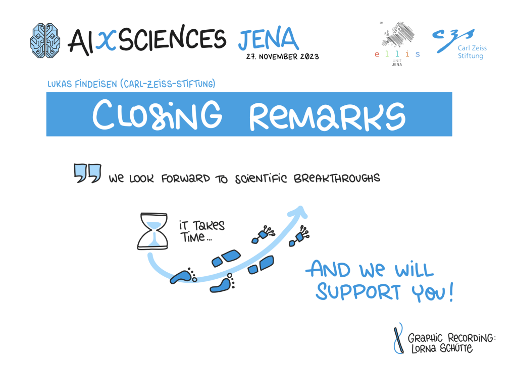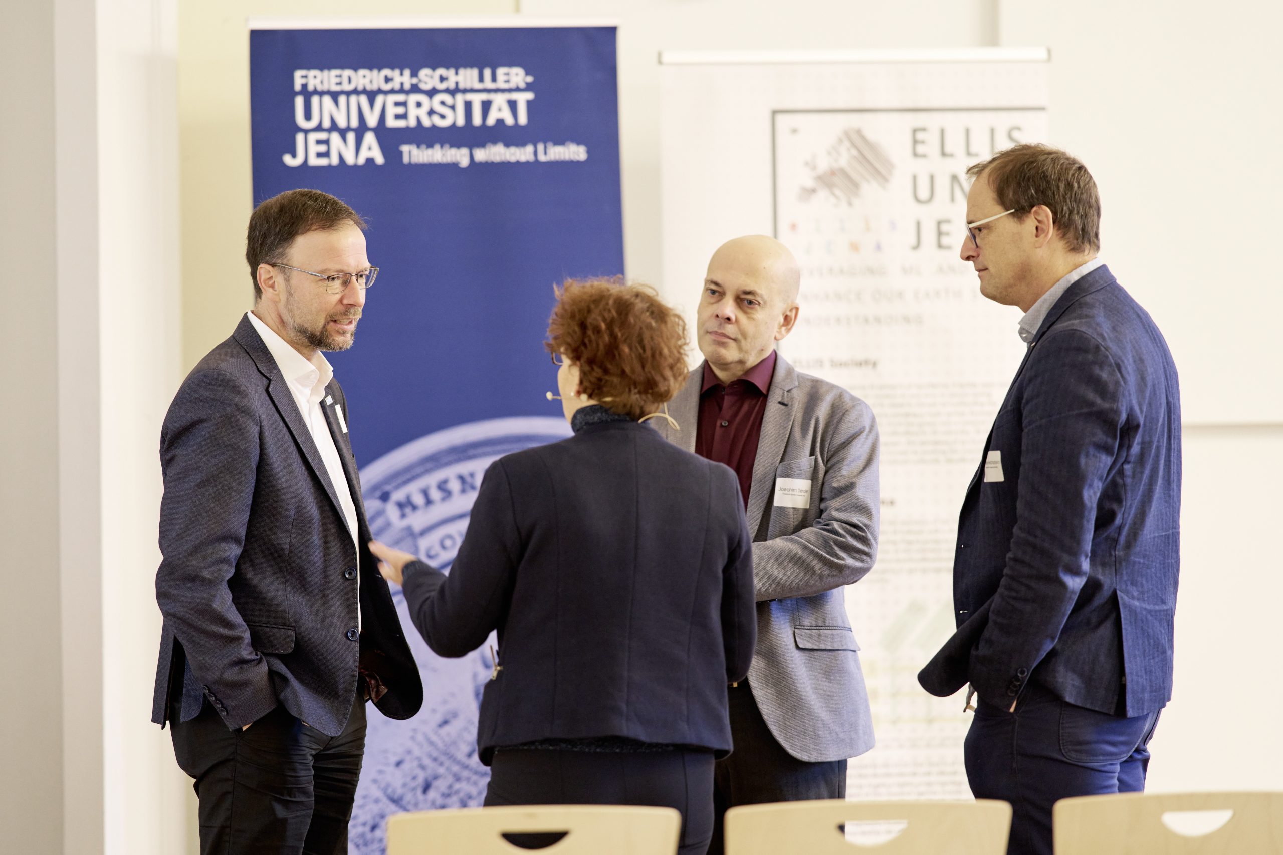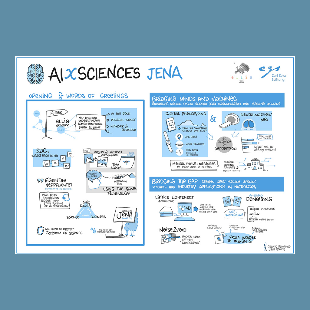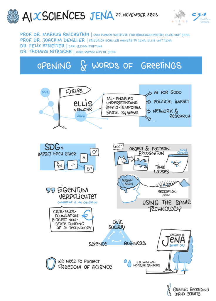 The opening of AIXSciences Jena was conducted by the directors of the ELLIS Unit Jena, Prof. Dr. Joachim Denzler and Prof. Dr. Markus Reichstein, in collaboration with the CEO of the Carl Zeiss Foundation, Dr. Felix Streiter, and the Mayor of Jena, Dr. Thomas Nitzsche. As the highlight of the event, keynote speakers, including Prof. Dr. med. Nils Opel from the University Hospital Jena, Prof. Dr. Miguel Mahecha from the University of Leipzig, and Prof. Dr. Jochen Triesch from Goethe University in Frankfurt, provided groundbreaking insights into their respective fields.
