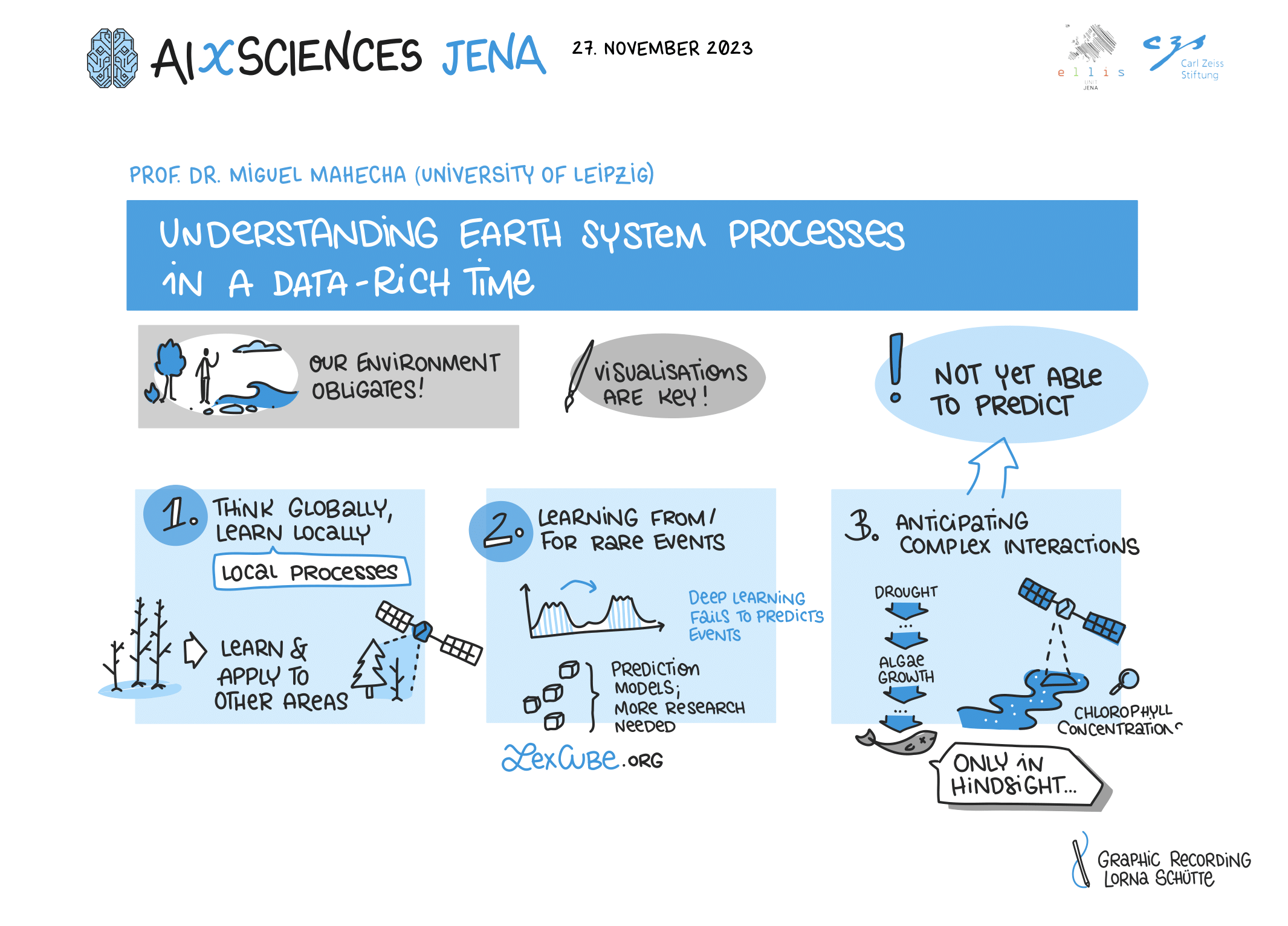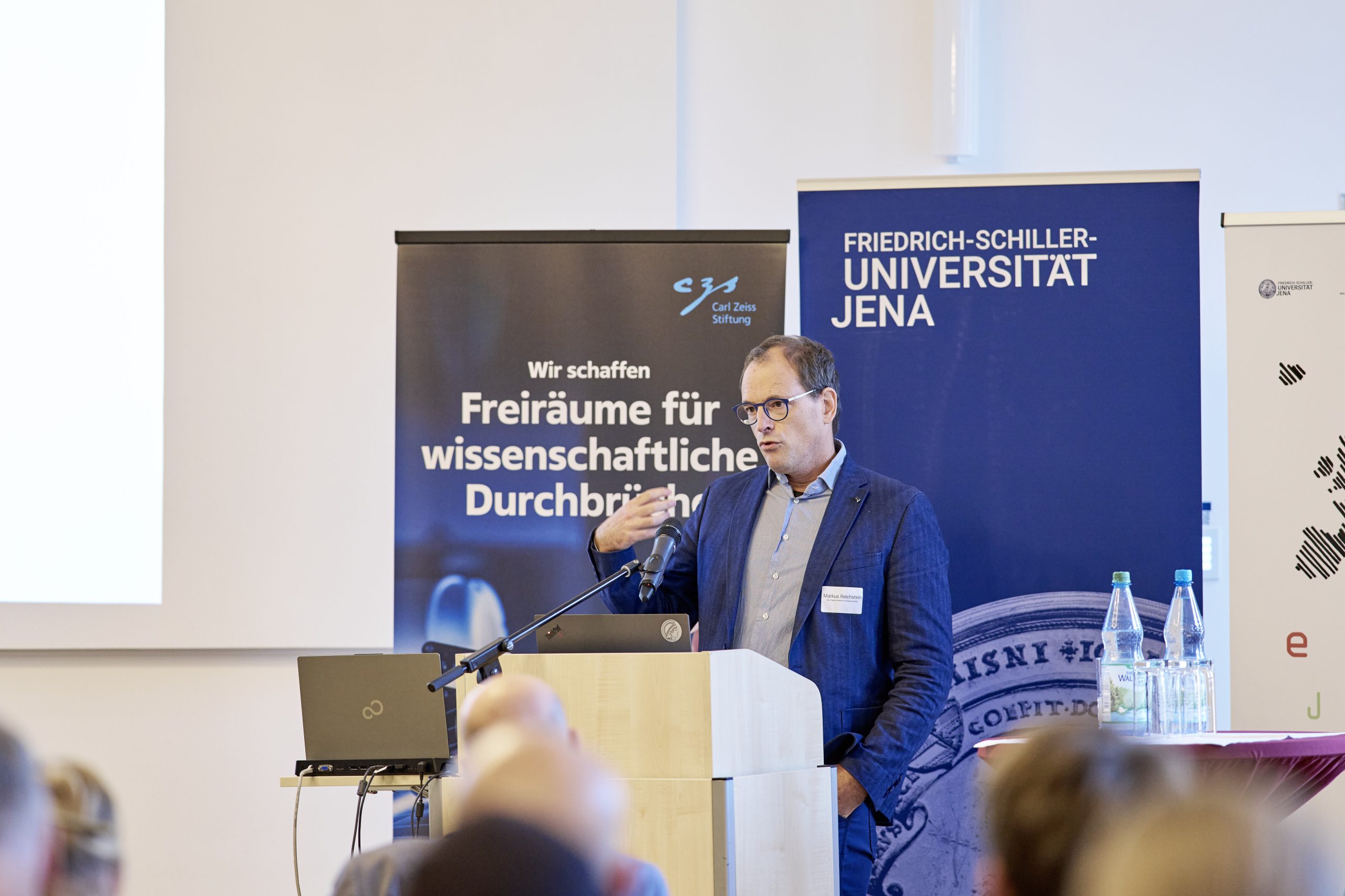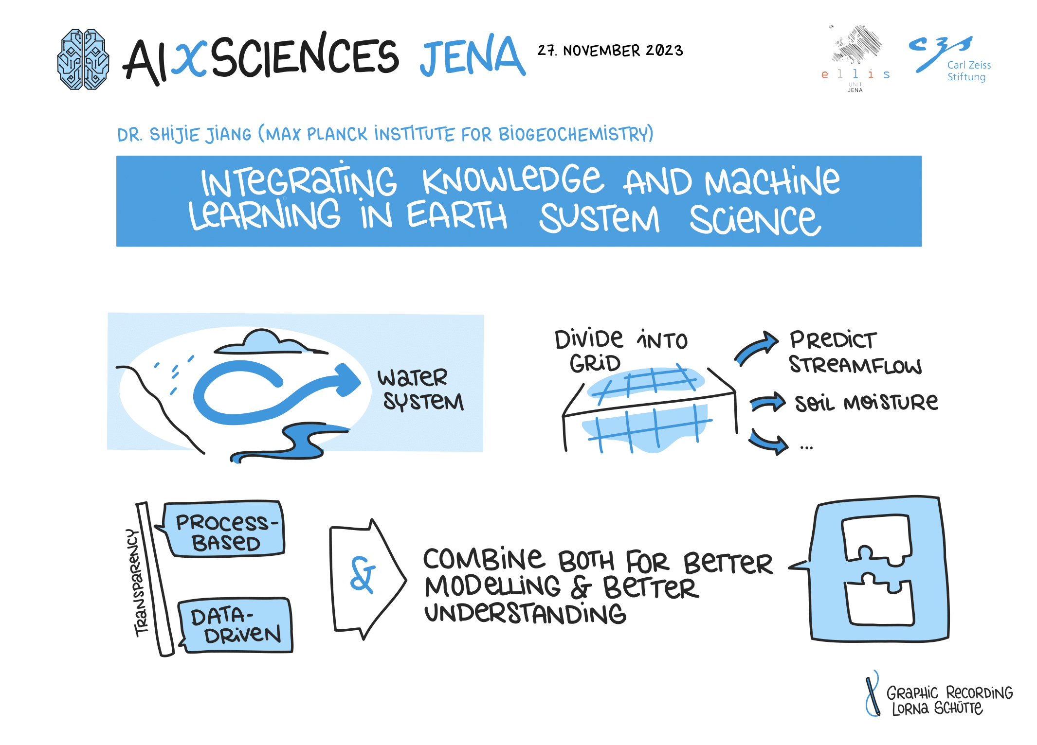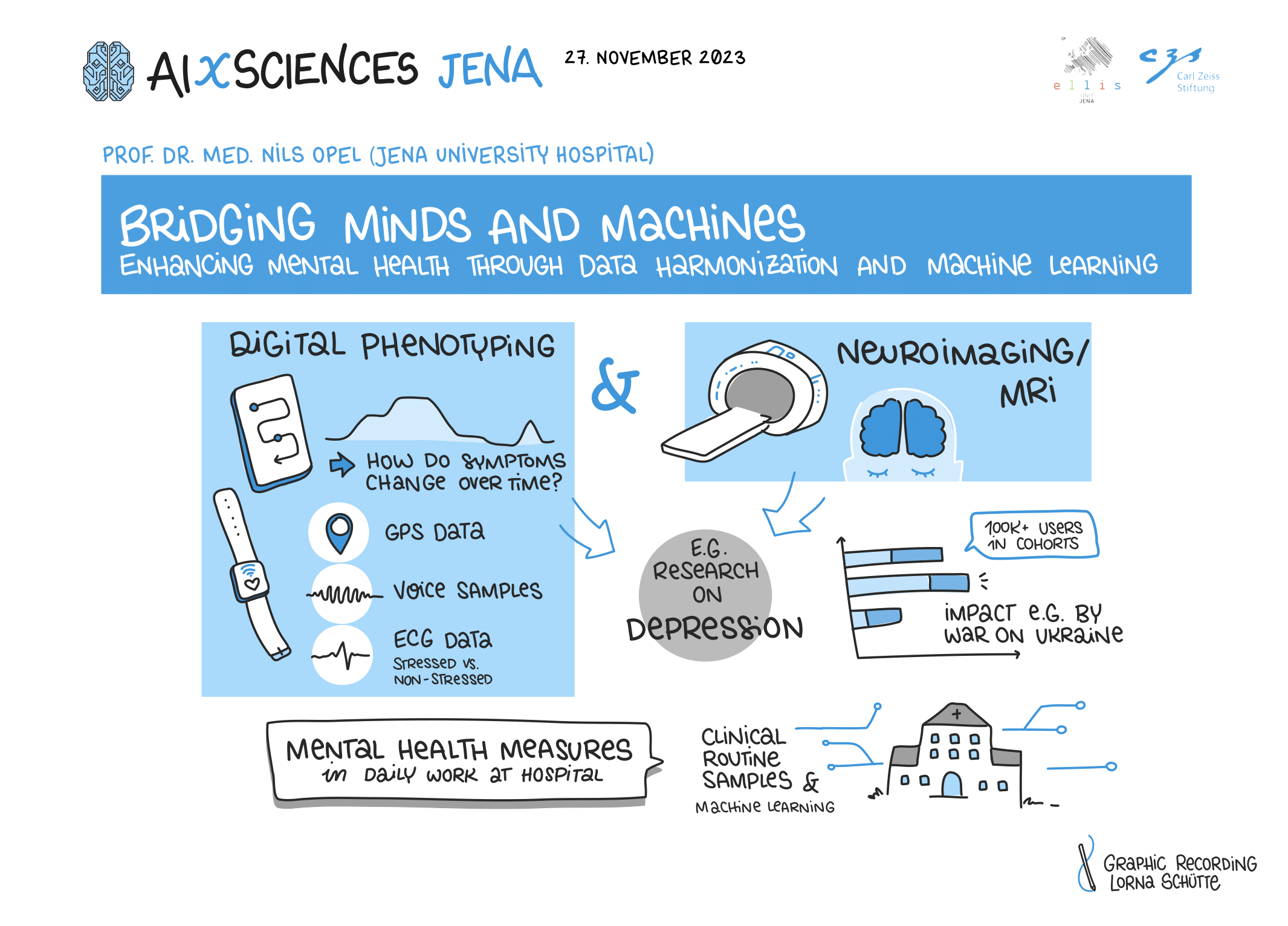 The opening of AIXSciences Jena was conducted by the directors of the ELLIS Unit Jena, Prof. Dr. Joachim Denzler and Prof. Dr. Markus Reichstein, in collaboration with the CEO of the Carl Zeiss Foundation, Dr. Felix Streiter, and the Mayor of Jena, Dr. Thomas Nitzsche. As the highlight of the event, keynote speakers, including Prof. Dr. med. Nils Opel from the University Hospital Jena, Prof. Dr. Miguel Mahecha from the University of Leipzig, and Prof. Dr. Jochen Triesch from Goethe University in Frankfurt, provided groundbreaking insights into their respective fields.