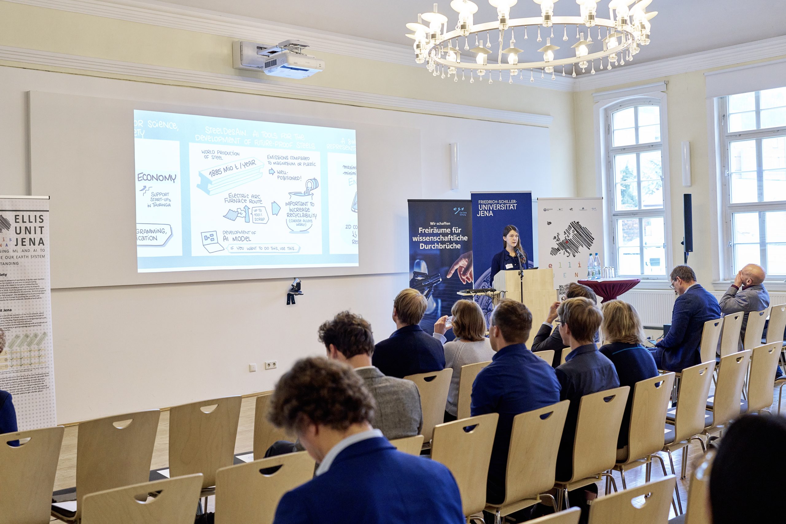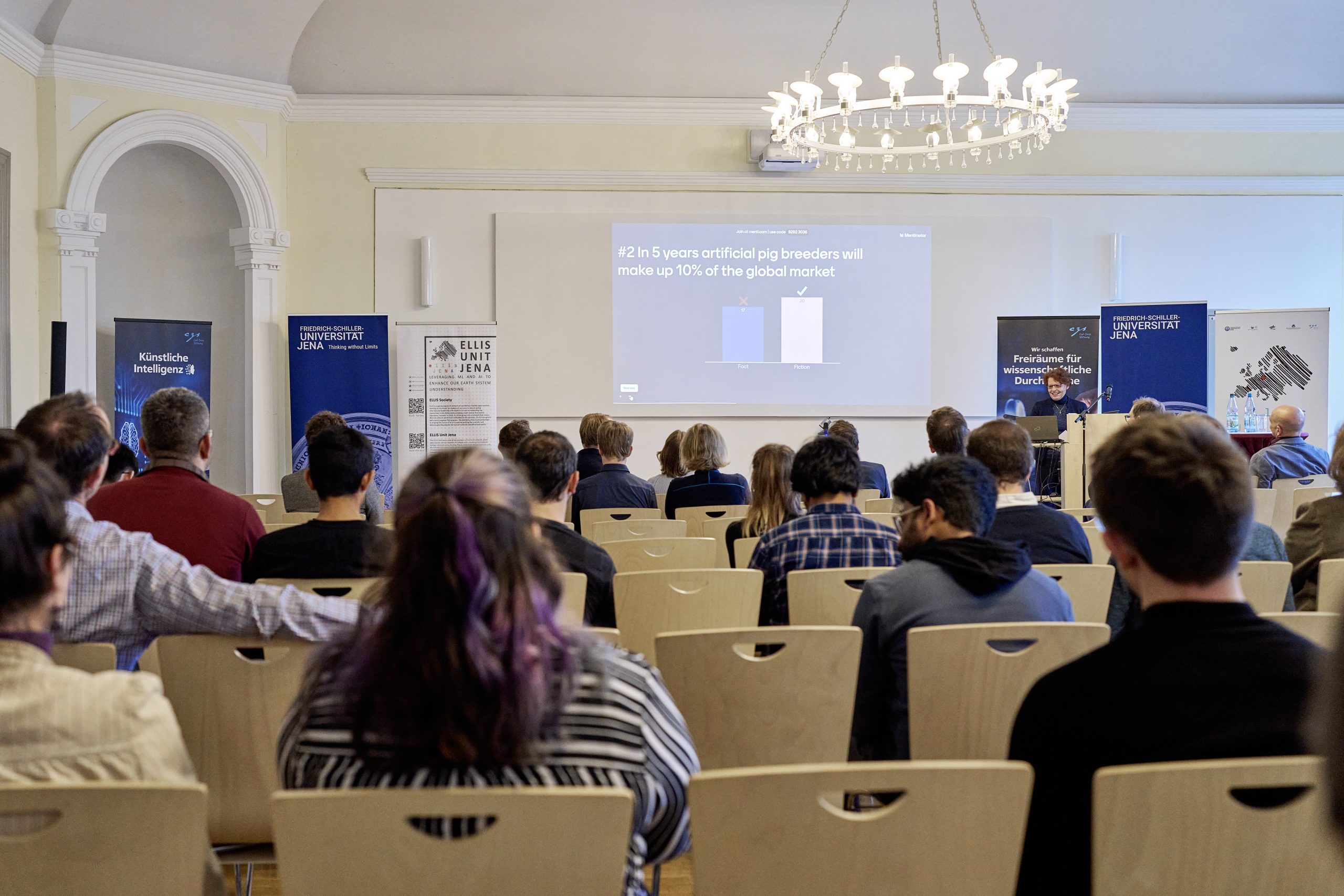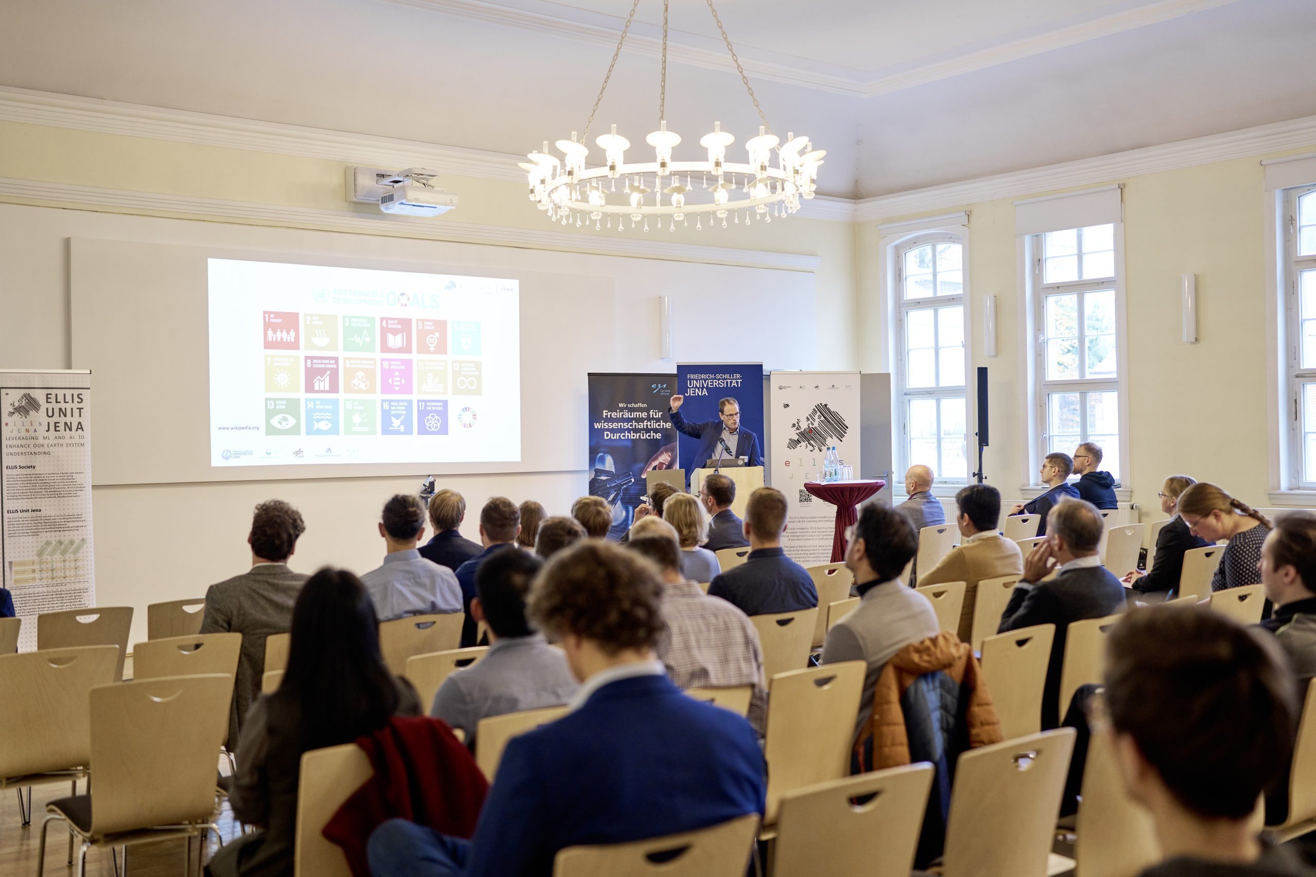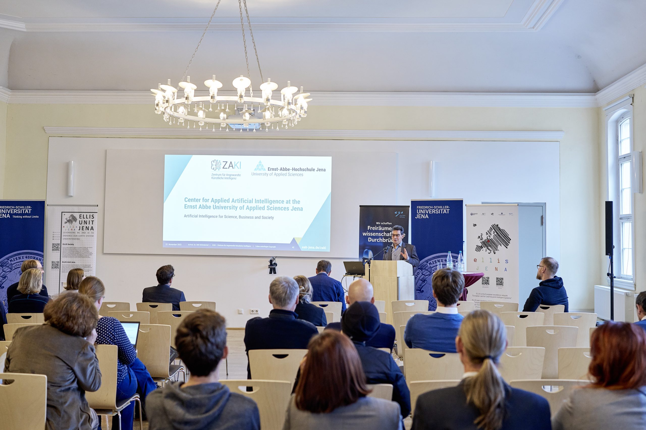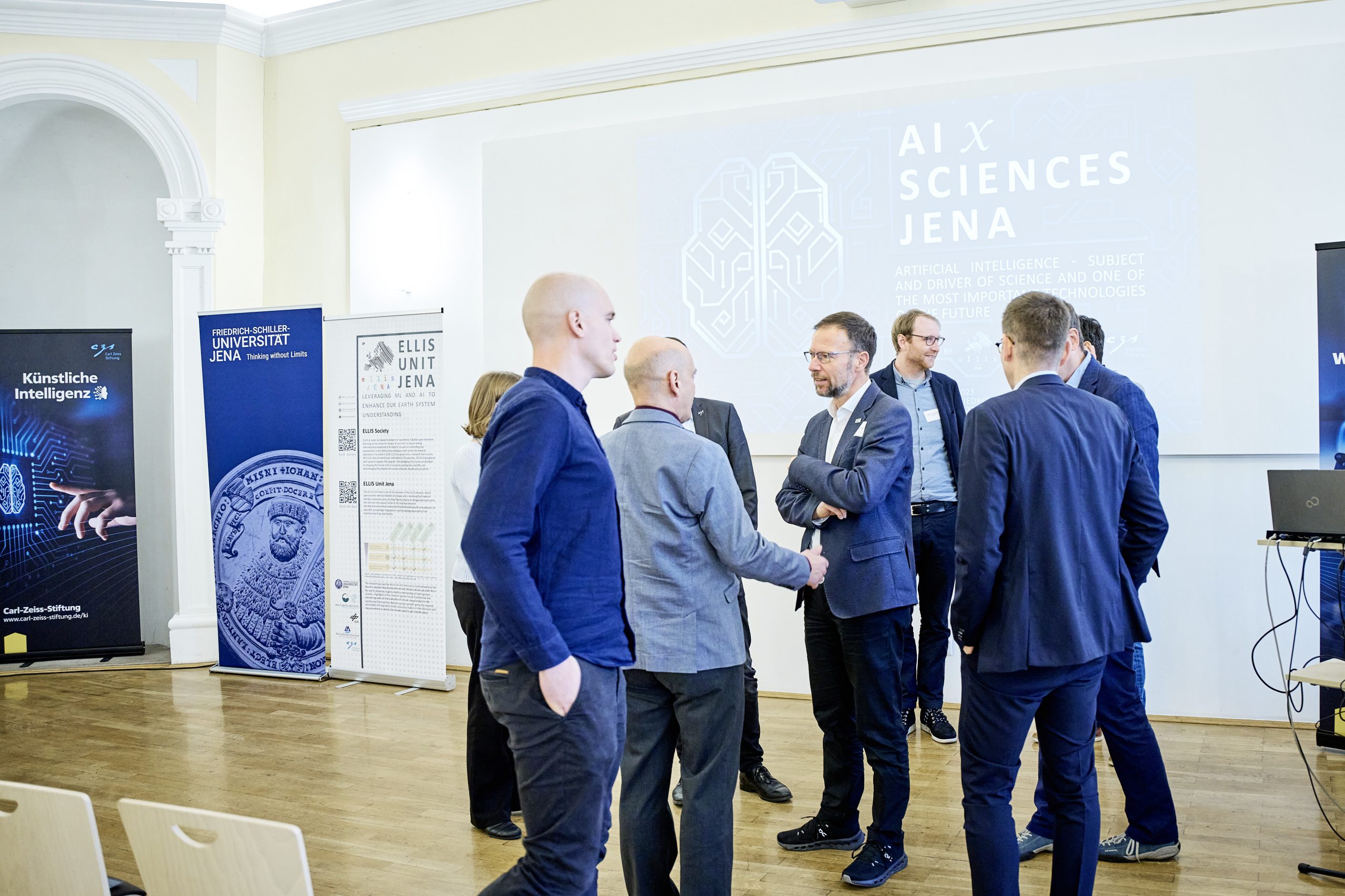 On November 27th, 2023, AI experts from various research projects in Jena gathered in the Rosensäle of Friedrich Schiller University Jena to exchange ideas on the topic of AI and present their developments and innovations. The event was organized by the ELLIS unit Jena in collaboration with the Carl Zeiss Foundation. Ranging from research in earth sciences to sensor-assisted surgery and smart communities, the projects showcased how AI could enhance daily lives and offered insights into the diverse research achievements in the field of AI in Jena.