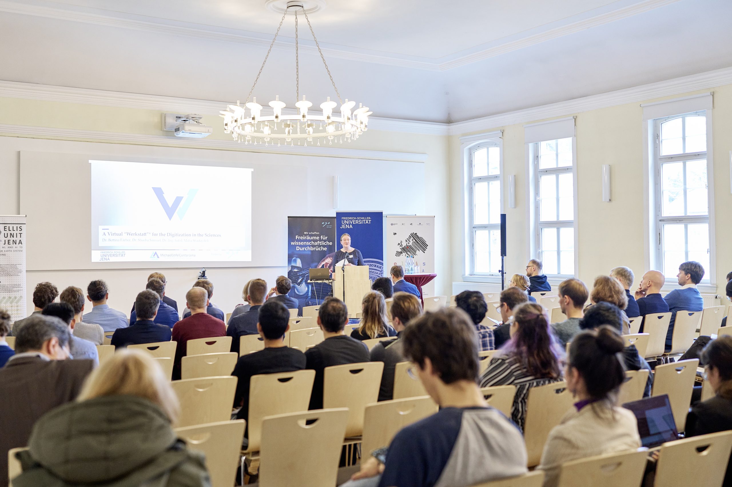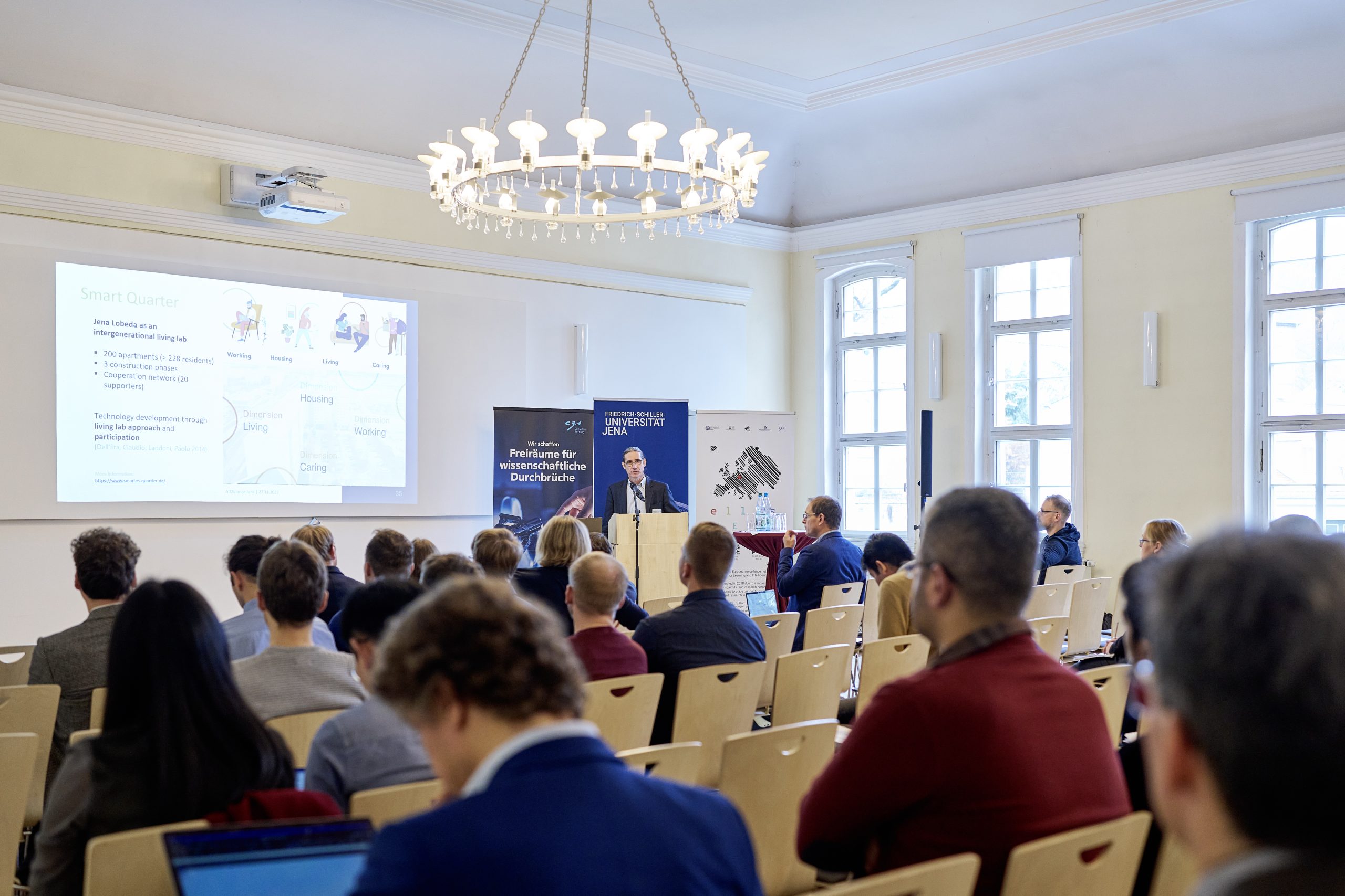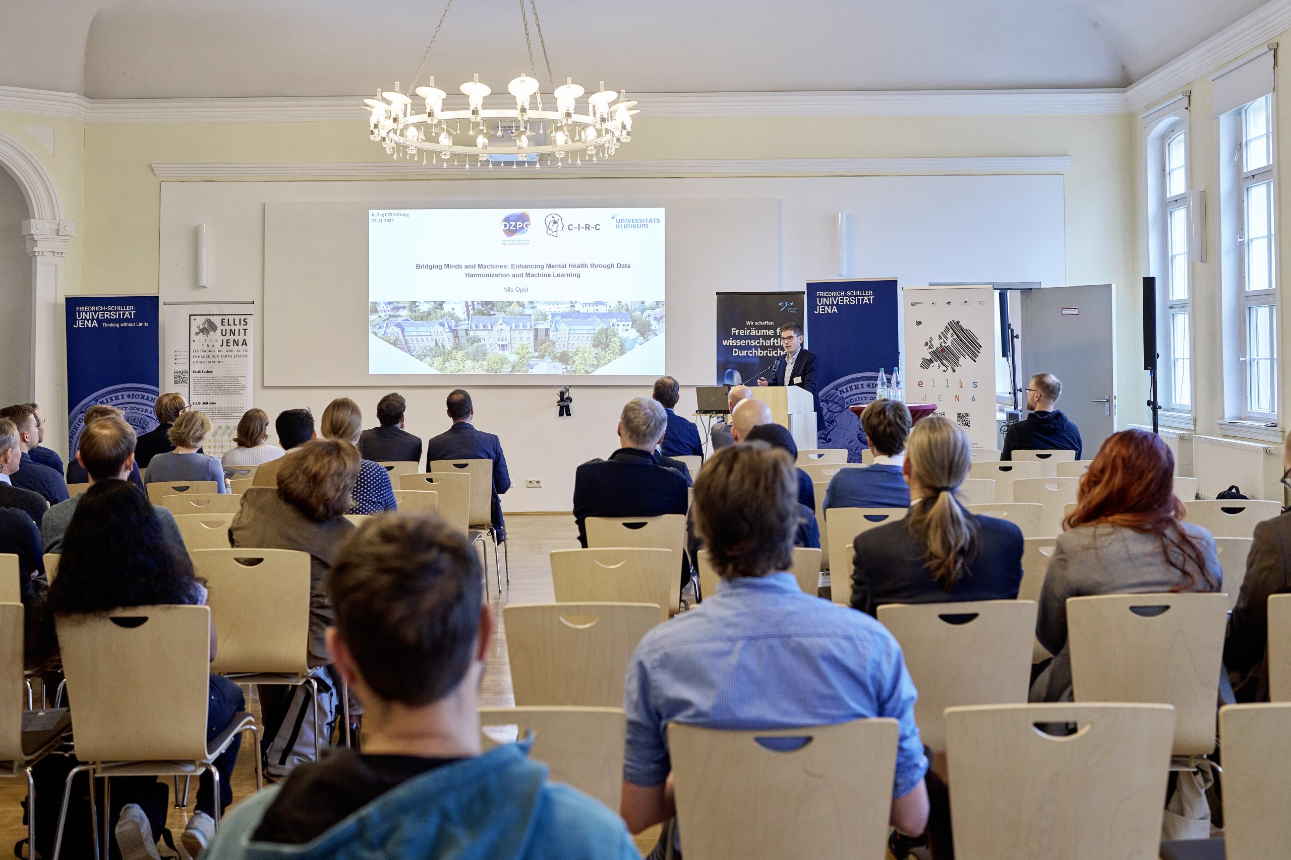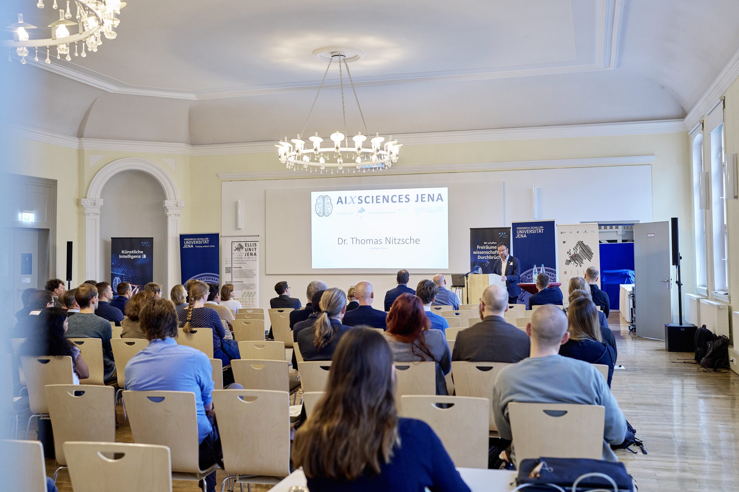 On November 27th, 2023, AI experts from various research projects in Jena gathered in the Rosensäle of Friedrich Schiller University Jena to exchange ideas on the topic of AI and present their developments and innovations. The event was organized by the ELLIS unit Jena in collaboration with the Carl Zeiss Foundation. Ranging from research in earth sciences to sensor-assisted surgery and smart communities, the projects showcased how AI could enhance daily lives and offered insights into the diverse research achievements in the field of AI in Jena.
