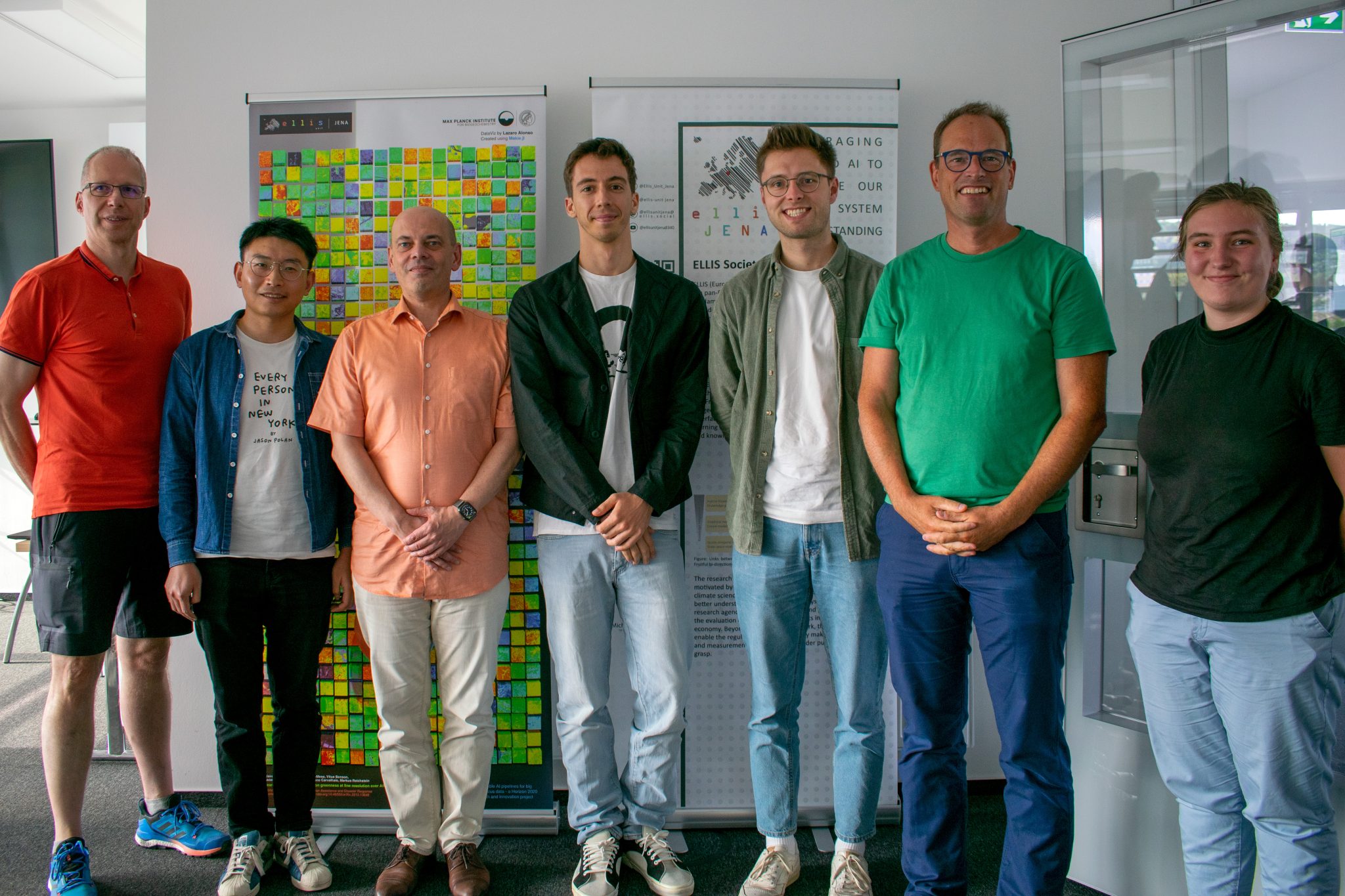 First group picture of all ELLIS PhD candidates within the unit Jena. From left to right: Prof. Dr. Joachim Giesen, Dr. Shijie Jiang, Prof. Dr. Joachim Denzler, George Blougouras, Vitus Benson, Prof. Dr. Markus Reichstein and Claire Robin.